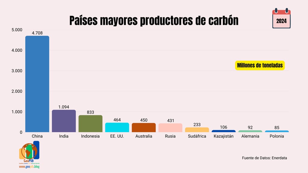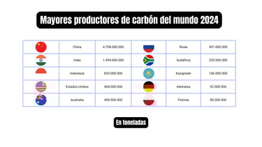 En esta sección se presentan los principales indicadores del mercado mundial del carbón. Con datos actualizados de 2024, se analizan los 10 mayores países productores, los 10 países con las mayores reservas y los 10 principales consumidores. Este análisis permite comprender la distribución geográfica del recurso, su disponibilidad y los principales centros de demanda.