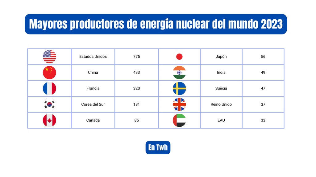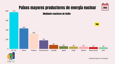 Cada conjunto de datos se acompaña de gráficos que facilitan una interpretación rápida y visual, ayudando a identificar tendencias, comparar capacidades y comprender el peso relativo de cada país tanto en la generación eléctrica nuclear como en el ámbito geopolítico.
