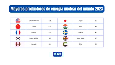 En esta sección se presentan los principales indicadores de la energía nuclear de fisión a escala global. Con datos actualizados desde 2023, se analizan los 10 países con mayor producción de electricidad a partir de reactores nucleares, el número de reactores operativos en cada uno de ellos y los países que disponen de tecnología nuclear con fines armamentísticos, es decir, aquellos que poseen ojivas nucleares. Este enfoque permite entender no solo la dimensión energética de la tecnología nuclear, sino también su relevancia estratégica.