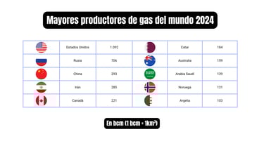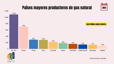 En esta sección se presentan los principales indicadores del mercado global del gas natural. Con datos actualizados de 2024, se analizan los 10 mayores países productores, los 10 países con las mayores reservas probadas y los 10 principales consumidores. Este enfoque permite comprender tanto la disponibilidad del recurso como su distribución geográfica y los principales focos de demanda.